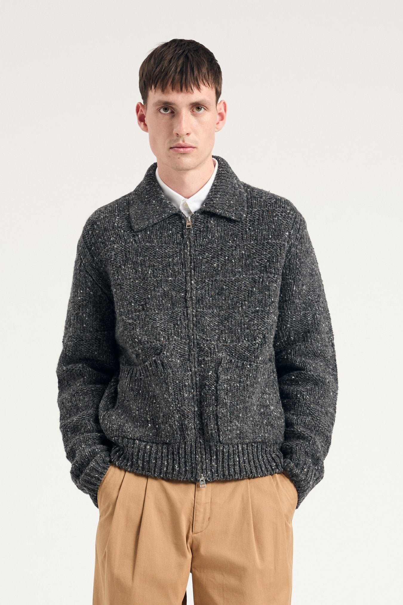 La coupe relaxed et les manches montées lui confèrent une allure confortable et naturelle, tandis que le col plein aiguille et les poches plaquées rappellent les influences du cardigan de travail. Une pièce chaleureuse et structurée, entre tradition et modernité.